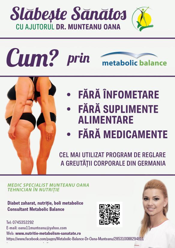 Medicul Specialist Oana Munteanu, Tehnician in Nutritie, ne propune cel mai utilizat program de reducere a greutatii corporale FARA INFOMETARE, FARA SUPLIMENTE ALIMENTARE, FARA MEDICAMENTE..METABOLIC BALANCE.