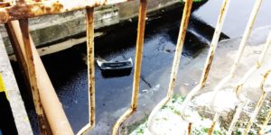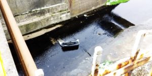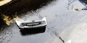 Nu stim daca usa portbagajului cu placuta de inmatriculare a ajuns in parau din cauza impactului sau a fost aruncata in urma “actiunii de curatire” a zonei.